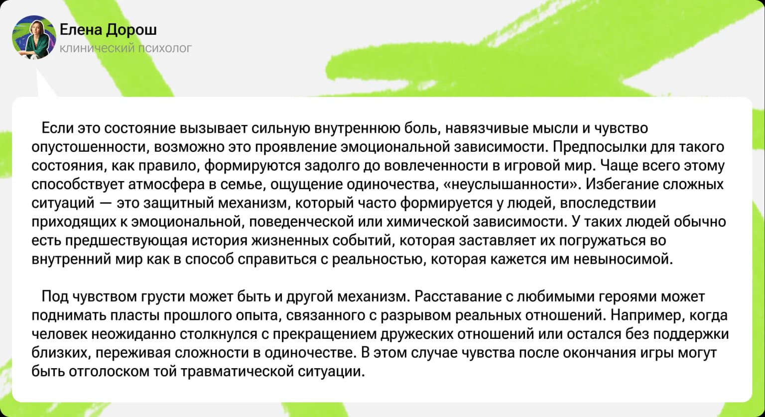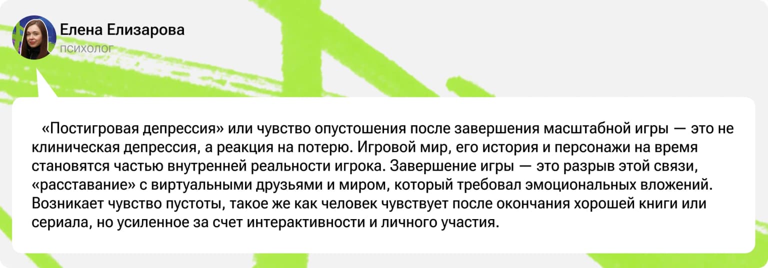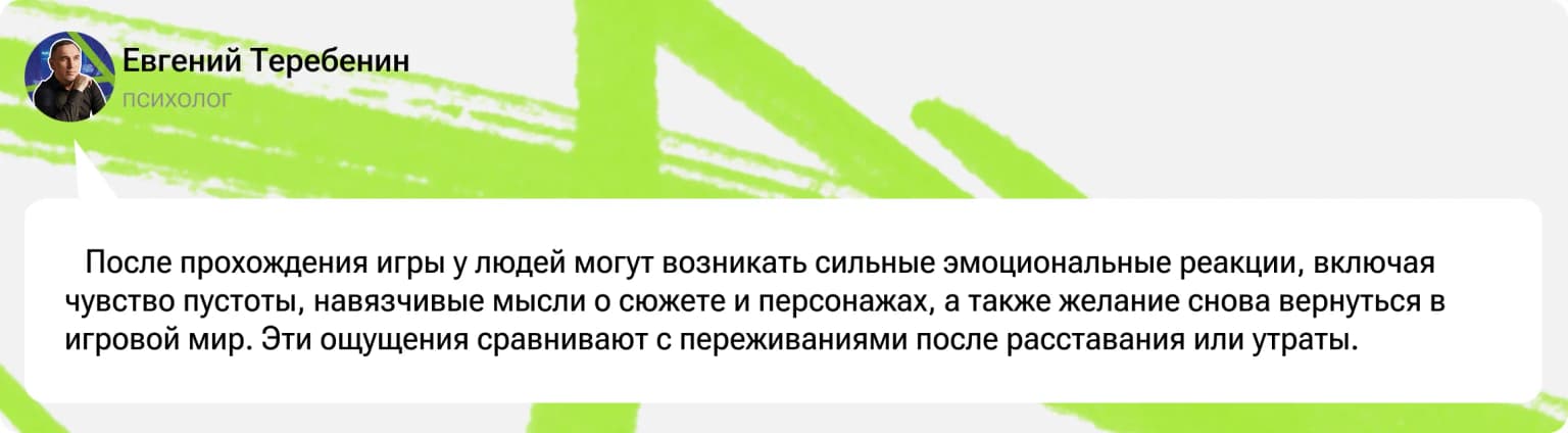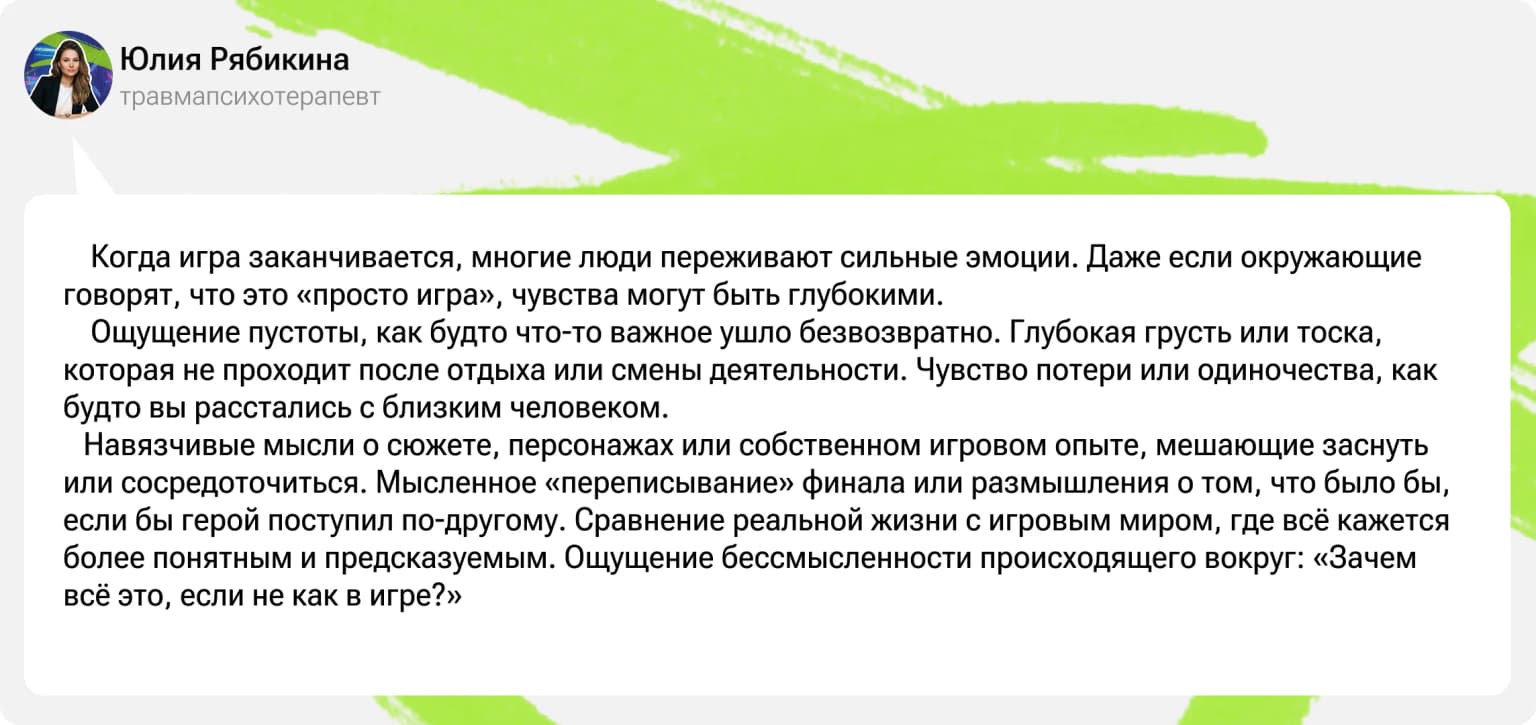 Недавно учёные доказали существование постигровой депрессии. После прохождения увлекательной игры геймеры очень часто не находят себе покоя и страдают от навязчивых мыслей. Мы поговорили с четырьмя психологами чтобы разобраться в явлении и найти выход из этого душевного состояния