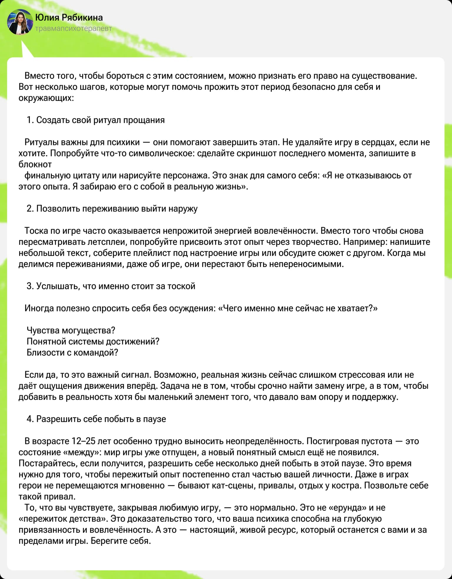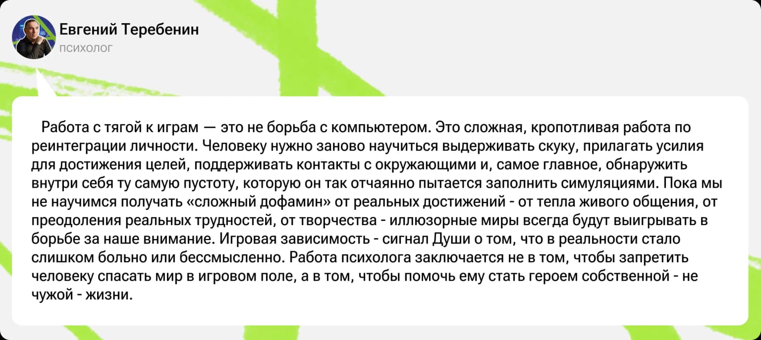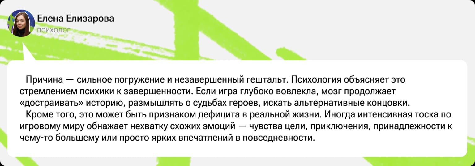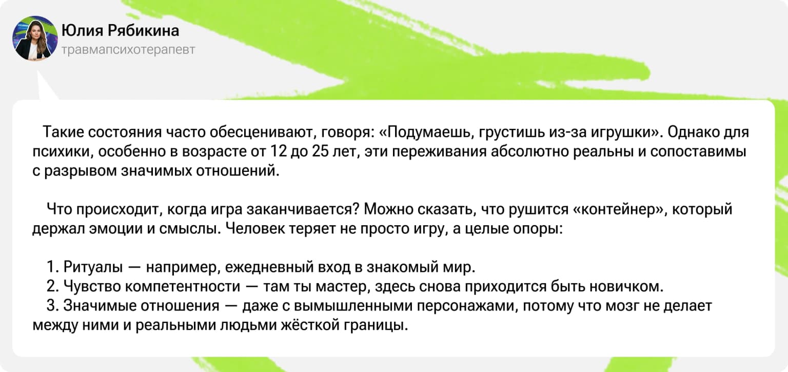Недавно учёные доказали существование постигровой депрессии. После прохождения увлекательной игры геймеры очень часто не находят себе покоя и страдают от навязчивых мыслей. Мы поговорили с четырьмя психологами чтобы разобраться в явлении и найти выход из этого душевного состояния